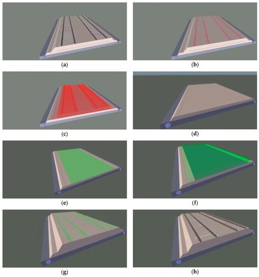 Figure 9 represents the construction phases: (a) existing rail track; (b) replacement of track; (c) removal of ballast; (d) substructure; € application of geotextile and geogrid; (f) new ballast tamping; (g) final track tamping; and (h) rehabilitated rail track. The elements represented in green were the object of construction during the task, and the elements in red correspond to a removal or demolition process as part of the task. The two tasks, “existing rail track” and “substructure”, were not real, but they were included with the aim of obtaining a more realistic simulation of the construction phases. The simulation of the different tasks planned for the rail track rehabilitation was obtained through the Simulate tab of the TimeLiner command.