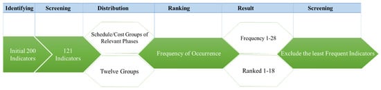 A broad list of the potential KPIs were identified as a result of reviewing more than two-hundred journal articles, conference papers, research reports, and dissertations. Figure 2 indicates the screening process that was followed to prepare the initial list of indicators for conducting this research. As it is shown in Figure 2, since some of the identified indicators were highly similar to each other, the authors combined the similar indicators in order to narrow down the list. All in all, 121 indicators were found and classified into the relevant schedule and cost performance of each EPC phase. Subsequently, all of the KPIs were classified into 12 groups, namely Change, Management, Contract, Client & Consultant, Planning, Scheduling and Estimating (PSE), Contractor, Labor, Project, Material, Equipment, and External.