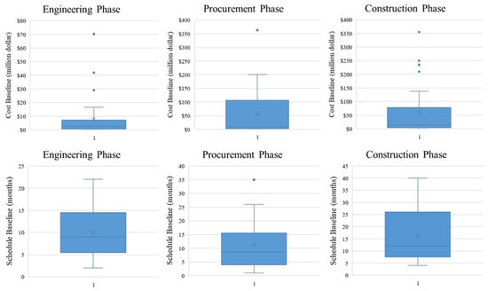 The average cost of the collected projects was $120 million, ranging from $0.4 million to $575 million. Moreover, the final duration of these projects varied from eight months to 54 months, with an average duration of 24 months. Figure 4 illustrates the phase-based baseline cost and schedule of the collected data while using the box-plot method. These box-plots demonstrate the range, maximum, minimum, and median values for cost and schedule baseline of the collected projects. As it is illustrated, the average value of construction and procurement phase was almost the same, at approximately $60 million. This average for engineering phase was about one-ninth of other groups, with around $7 million. On the other hand, the average time scheduled to complete the construction phase of industrial projects was higher than other EPC phases, being 16 months. However, the engineering and procurement phase took ten months on average to reach completion.