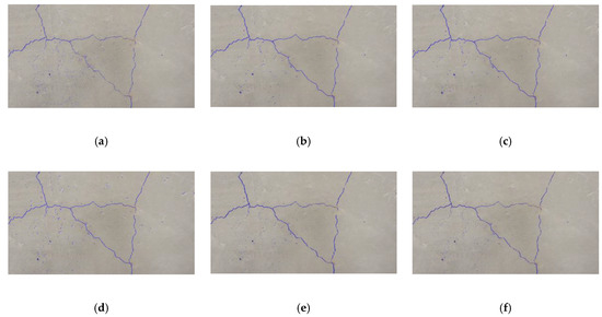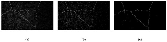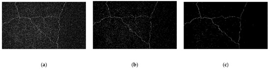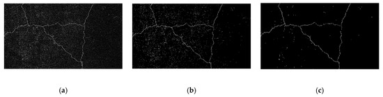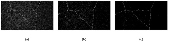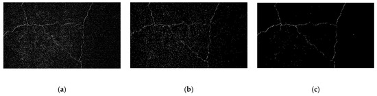 The value of area threshold gave some idea of the continuity of cracks in the defected images. was defined in Equation (18) as the standard deviation of the areas of connected components . When the continuity of cracks in the binary image was poor (i.e., the cracks were discontinuous), was small. Conversely, when the cracks in the binary image were highly continuous, increased. Thus, higher values of implied a higher degree of continuity of cracks in the binary image. Additionally, when the cracks were highly continuous in binary images from the defected dataset, the value of would be much higher for the defected dataset than for the sound dataset. Such was the case for the Prewitt, Sobel, and LoG filters. The same was also true, but to a lesser degree, for the Butterworth and Gaussian filters. The values of for the sound and defected datasets using the Roberts filter were similar. This suggested poor continuity of cracks in the binary images, which was confirmed in Figure 10a. Considering that the Roberts filter was among the worst methods tested here, this result was not at all surprising. The cracks in the rest of the binary images from the defected dataset (Figure 10b–f) were visibly more continuous.