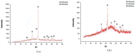 Fly ash particles are spherical in shape, obtained from a mid-burning of powdered coal. The chemical composition of fly ash contains silica, alumina and minor measured oxides viz: Fe, Na, Ca, Mg and K. The synthetic constituents in class F fly ash are silica and alumina, both accounts for over 90% of chemical compounds present in fly ash, which was obtained by XRF (X-ray fluorescence) analysis [,,]. The flyash was obtained by National Thermal Power Corporation, Vijayawada, Andhra Pradesh, India and its specific gravity value is mentioned in Table 3. GGBFS was acquired from JSW cements, Vijayawada, A.P. and India. Figure 1a,b depict the X-ray diffraction (XRD) analysis of fly ash and GGBFS samples, respectively.