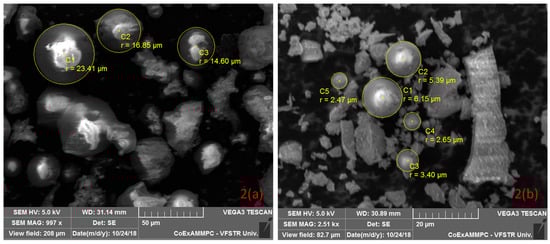 Scanning electron microscope (SEM) analysis was conducted on fly ash and GGBFS samples to determine the particle size distribution. Figure 2a,b show the microscopic images of fly ash and GGBFS, respectively. The SEM images of fly ash particles depict the shape as spherical and size ranging from 14 to 23 µm, while the shape of GGBFS particles tetrahedron and size of particles range from 2 to 6 µm. Geopolymers are generally formed by the synthesis of fly ash by alkali activators [].