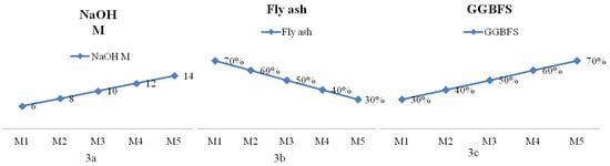 Flyash and GGBFS synthesized geopolymer mortar is prepared similar to Portland cement mortar by replacing the cement with fly ash and GGBFS and water with alkaline activator solution. The word “Geopolymer” portrays a group of mineral fasteners that have a polymeric silicon-oxygen-aluminum system structure, like that found in zeolites, however without the crystal structure []. The geopolymerization procedure includes a significantly rapid response in the very basic form on Si-Al minerals with the intention of outcome a three-dimensional polymeric chain and ring structure comprising of Si-O-Al-O bonds. Geopolymers are regularly combined by blending industrial byproducts containing alumino-silicate and the basic arrangements. Source materials utilized are kaolinite, clays, zeolite, flyash, silica fume, slag, POFA (palm oil fuel ash), rice-husk powder, red mud and some other []. The majority of widely recognized antacid fluid utilized in geopolymerization is a blend of NaOH/KOH and Na2SiO3. At the point when any of the above source materials for instance fly ash (FA) in strong frame are blended by means of antacid arrangements of suitable fixation and Na2SiO3, geopolymers are shaped amid the polymerization response of fly ash []. Dissimilar molarities of NaOH solution (Figure 3a), fly ash percentage (Figure 3b) and GGBFS percentages (Figure 3c) for different geopolymer concrete mixes are shown in Figure 3.