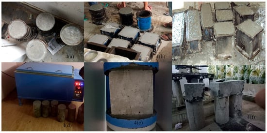 (a) Geopolymer concrete cylindrical specimens casting, (b) casting of cube specimens, (c) cube and cylindrical specimens, (d) cylindrical specimens for oven curing, (e) testing of cube for compressive strength, (f) Failure of specimens after testing.
