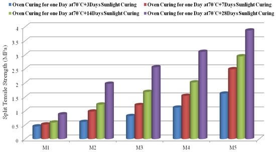 - The maximum split tensile strength was 3.87 MPa obtained at 14 M of NaOH solution and at 70 °C oven curing for 24 h as well as 28 days of sunlight curing. Similarly, the maximum flexural strength value is 11.02 (for mix M5) at the curing of 70 °C in the oven and 28 days of sunlight.
