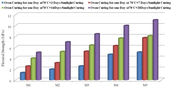 The flexural strength of geopolymer concrete by the use of simple beam/prisms with third point loading, this procedure is commonly referred to as modulus of rupture. To determine the flexural strength of geopolymer concrete, prism moulds (100 × 100 × 500 mm) were used and the specimens underwent one day oven curing at a constant temperature of 70 °C simultaneously sunlight curing for 14 and 28 days respectively. The flexural strength of geopolymer concrete at these curing conditions is mentioned in Figure 7. The geopolymer concrete mix consists of different molarities of NaOH (6, 8, 10, 12 and 14 M), and out of all these proportions the 14 M mix (M5) was gained higher flexural strength values at 24 h in the oven (70 °C) + 28 days sunlight curing. In total, 4 beam specimens were prepared in each mix and cured for 24 h in an oven plus 3, 7, 14 and 28 days in sunlight.