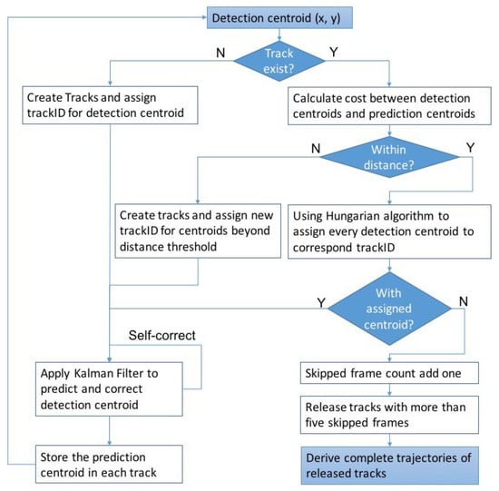 - The Hungarian algorithm is used to assign the rest of detected centroids to existing tracks by minimizing the sum of cost between assigned detected centroids and predicted centroids in tracks.