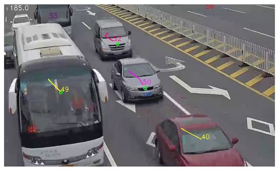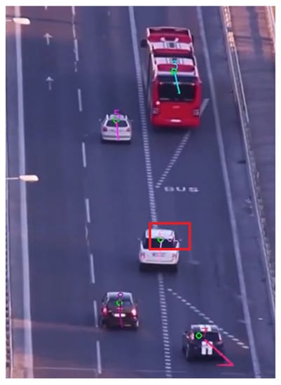 - Solid-line crossing: Recognized by establishing whether the trajectory of a detected vehicle intersects with a buffer created around the solid line (two white lanes in Figure 5). If the centroid of the detected vehicle is within the created buffer, it is determined as crossing the solid line.