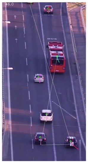- Speeding: Identified by a comparison between the speed limit and the detected average velocity of the observed vehicle while traveling in a specified region. As shown in Figure 5, two green boundary lines are set for recording where and when a vehicle enters and leaves the region. The positions and frame numbers of a vehicle are recorded once the vehicle passes the upper green line or the lower green line, and time is correspondingly recorded. To correct the perspective effect of a traffic camera, a projective transformation [23] is used to map every point in the footage to its real-world coordinates on the ground plane. For speed estimation, Equation (1) is used:where v is the speed, s is the distance that the vehicle traveled between the upper green line and the lower green line area, (, ) and (, ) are the centroid coordinates of vehicles on the ground plane, and and are the traveling time between entering the ith frame and leaving the jth frame.To detect anomalous speed above or below the speed limit, we define an uncertainty margin for the estimated speed. The uncertainty of the estimated speed is calculated based on the theory of variance propagation, using the uncertainty of traveled distance s and travel time t. Assuming that distance and time are mutually independent, we have:where and are the standard deviation of traveled distance and travel time, respectively, which are obtained from the position of the detected vehicle in multiple consecutive frames. Specifically, the standard deviation of distance is computed by measuring the distance traveled between two consecutive frames across n frames. For the standard deviation of travel time, a constant value corresponding to a time interval between consecutive frames is assumed.
