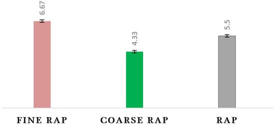 FRM was designed with 35% fine RAP particles, including 2.3% aged bitumen and 2.2% virgin bitumen. CRM was designed with 54% coarse RAP particles, including 2.3% aged bitumen and 2.2% virgin bitumen. Recovered bitumen (4.3%) was measured for CR particles, and bitumen content was 6.6% for FR particles. Designed mixes were compared with the control mix, and the following results were achieved: