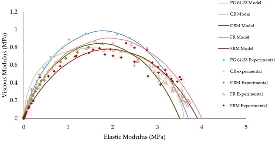 Figure 5 shows the 2S2P1D Cole–Cole plot of the shear complex modulus at different temperatures and frequencies for all recovered bitumen from CR, CRM, FR, FRM, and control mix. 2S2P1D was adopted to model the shear modulus of recovered bitumen. From
