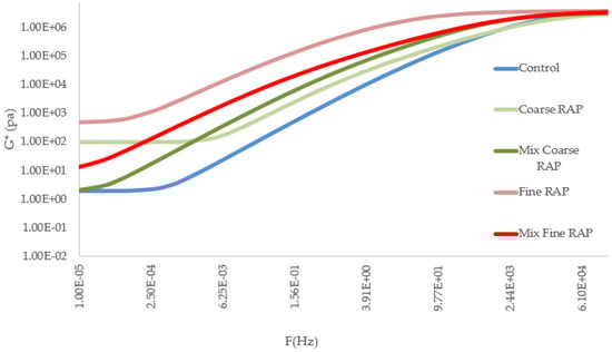Figure 6 shows the master curve of shear modulus (Pa). The G* values of FR and CR were higher than the other mixes. Asphalt production, lifetime, and presence of air impacted the aging progress. A single source of RAP was used for CR and FR. Then, since all these factors were the same for CR and FR, the recovered bitumen was supposed to have the same master curve.