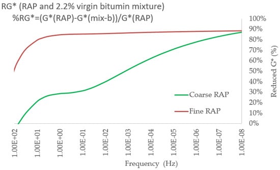 The Reduced G* (RG*) index was looked at to clarify the interaction of RAP bitumen with virgin bitumen according to RAP particles. G* was determined for CR and FR as well as for CRM and FRM. According to CRM (FRM) mix design, CR (or FR) was added to the 2.2% virgin bitumen. The difference between CR (or FR) and CRM (FRM) showed the impact of virgin bitumen on total bitumen stiffness. (RG*) is calculated by Equation (2) as a percentage: