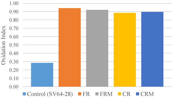 Table 1. The C=O and S=O indices both increased significantly with RAP and blended bitumen relative to the virgin bitumen. There was a small increase in the RAP bitumen compared to the blended bitumen in the indices. The aging indices were higher for the fine RAP, likely because of its higher surface area, compared to the course RAP, which allowed for a greater degree of aging. The sulfoxide indices for all bitumen were higher, as was typical for asphalt bitumen [