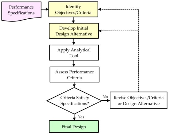 Many developed countries around the world are moving toward performance-based analysis (PBA) away from the traditional perspective design. The perspective approach focuses on the means to develop a design and simply involves applying codes/standards to design an engineering element. In fact, this approach assumes that the safety objectives are implicitly defined. On the other hand, PBA requires explicit definition of objectives and performance specifications, as shown in Figure 1. The design process primarily focuses on the objectives, related performance criteria, and development of innovative solutions to optimize the design [,]. Thus, PBA can be viewed as the practice of thinking and working in terms of the ends rather than the means. In this respect, the PBA concept used in this paper can be applied to any stage of a project, including planning, design, operation, and management.