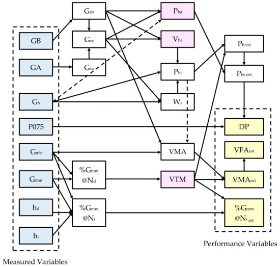 For stage 3, the design involves evaluation of selected trial blends of the Superpave aggregate structure based on volumetric, compaction, and dust proportion requirements []. This research incorporates the uncertainties of all variables involved in the process and develops a revised procedure for comparing mixture properties with the PB criteria. The developed mathematical formulas of uncertainty were verified using MC simulation. Figure 2 shows the mathematical path for four asphalt mix properties (performance variables) involved in the PB evaluation process. The uncertainty of the performance variables is calculated based on the uncertainty of eight measured variables. However, there are 13 intermediate variables that also possess uncertainty and should be checked for reliability []. This figure helps the designer trace the uncertainty of the unreliable variables back to the measured properties so that their precisions may be revised. Some issues related to uncertainty analysis are discussed in Section 5.1.