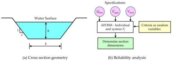 Similar to any civil infrastructure, water structures (e.g., water distribution network, channel cross sections, and river structures) require an optimal design to improve serviceability with a minimum life-cycle cost. Various applications in this area [,,,,,,,,,,,,] are summarized in Table A4. Earlier research work on applying reliability in water structures was related to cross section design. Easa [] applied FOSM to design the dimensions of the cross section such that the runoff exceeds the capacity by a specified . Later, Easa [] extended this work to design a trapezoidal cross section based on three failure modes (see Figure 3): runoff Q exceeds capacity , water velocity V is less than minimum velcoity for deposition , and V exceeds maximum velocity for erosion . The performance criteria were considered as random variables. AFOSM was used to model the three failure modes, and the system probability of failure that accounts for the correlations among the modes was formulated. Another element of water-structures in which reliability has been implemented was port dredging. Scott [] applied FOSM for estimating the uncertainty of dredge production measures considering the uncertainties of the component variables. Two types of production systems (pipeline and hopper dredges) were considered. For these dredges, the production criteria were pipeline volumetric flow rate (or hopper volumetric load) and pipeline solids flow rate (or hopper solids load).