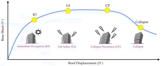 The concept of PBA has been rapidly growing in structural engineering and has been used in several areas, including earthquake engineering, wind engineering, and bridge engineering. The goal of performance-based seismic design (PBSD) is to incorporate a pre-defined level of performance during the design stage so that post-earthquake damage is retained to a certain acceptable level. The damage level and performance differs depending on the type of structure and its usage. The National Guidelines for Seismic Rehabilitation of Building codes (e.g., FEMA 356 and FEMA 445) laid a solid foundation for the PBSD to evaluate the design options with respect to different performance/safety levels, including operational level (OP), immediate occupancy level (IO), life safety (LS), and collapse prevention (CP) (see Figure 4). The pushover analysis is commonly used in PBSD to assess the safety level. It first starts with applying a certain load or base shear (V). Then, the displacement of any weak link can be found within the structure. Through iteratively applying different loads, the displacement (D) can be captured and the V–D relationship is plotted as a pushover curve. Interested readers are referred to [,] regarding structural and nonstructural performance levels. Practical implementation of PBA has been aided by the development of design guides and books. Examples include National Performance-Based Design Guide [], Performance-Based Building Design [,], Performance-Based Optimization of Structures [], Advances in Performance-Based Earthquake Engineering [], Performance-Based Seismic Engineering [], and the latest Guidelines for Performance-Based Seismic Design of Tall Buildings, Version 2.03 [].
