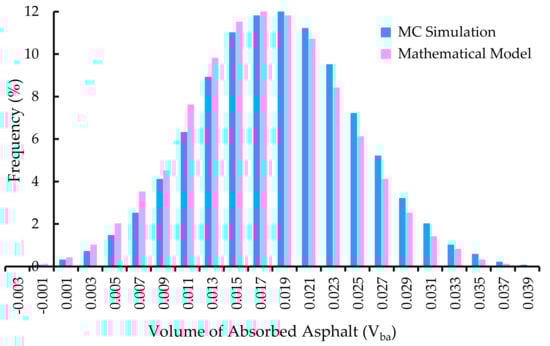 The MC simulation is another numerical tool used for PBA. The method is simple and can be applied to almost all reliability problems. However, the limit state function needs to be evaluated many times with random sampling of the component random variables. This can be expensive and time-consuming for problems with implicit limit state functions or where failure probability is low. Further details on the preceding analytical and numerical reliability methods can be found in the literature, see for example [,,]. Note that MC simulation has also been used to verify PBA analytical tools. For example, Figure 5 shows a comparison of the uncertainty-based mathematical model and MC simulation for the volume of absorbed asphalt () []. The simulation involved generating 50,000 random values of the component random variables, substituting them in the respective equation of , and establishing the frequency histogram. The burble-colored columns in the figure represent a normal distribution with the mean and standard deviation of calculated using uncertainty analysis. According to the central limit theorem [], when a variable is a function of several random variables, its probability distribution tends to be normal, regardless of the types of distribution of the component variables. This explains the close agreement between the mathematical and simulation results in the figure.