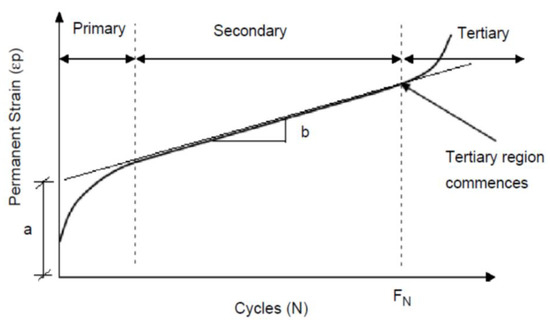 In the flow number test, the permanent strain at each cycle is measured while constant deviator stress is applied at each load cycle on the test sample. Permanent deformation of asphalt pavements has three stages [1]: (i) primary or initial consolidation; (ii) secondary; and (iii) tertiary or shear deformation.