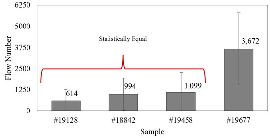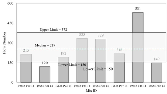 The flow numbers for each group and their variations, 95% CI boundaries, etc., are presented in Table 4 and Figure 5. They show that SX(75) PG 58-34 had the lowest flow number and SMA PG 76-28 had the highest flow number. Comparing the average flow numbers with the above-listed values, the following may be concluded: