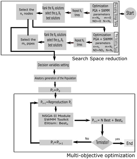 The proposed methodology of this work is composed of two complementary parts that together form a complete drainage network optimal rehabilitation methodology. The first part is called Search space reduction and it reduces the number of decision variables of the addressed problem. The problem size is reduced. Once the problem size is reduced, if an optimization is applied to this search space reduction model, the computation time will be reduced due to the reduction of local minima. This will result in the obtainment of better results, respectively, to the optimization of the complete model. The second part is the application of a multi-objective evolutionary algorithm that can be applied to any drainage network. The aim of this part is the optimization of the new model obtained from the problem size reduction. The flow chart of the proposed methodology is presented in Figure 1.