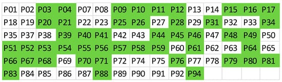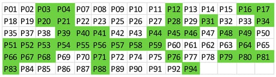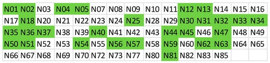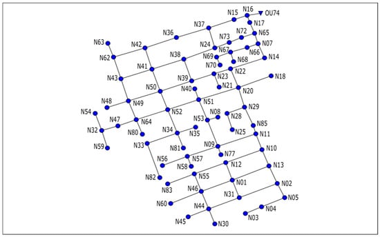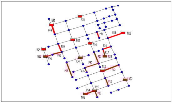 After the simulations, obtained solutions are also ranked from the best to the worst objective function value of Equation (4). A percentage pm of the best solution is selected. An analysis of these solutions creates a list of ms possible pipes to be substituted locations. These pipes are located where substitution can occur if the network is rehabilitated. These nodes are selected because they are repeated locations of a pipe substitution within all the pm selected solutions.
