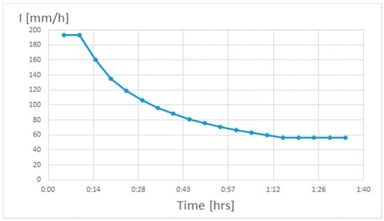 From the first hydraulic analysis performed in SWMM, the total flooding volume of the network is about 4271 m3, which represents 27.14% of the generated runoff (15,735 m3) from the selected rainfall. The IDF curve of the project rain is presented in Figure 3.