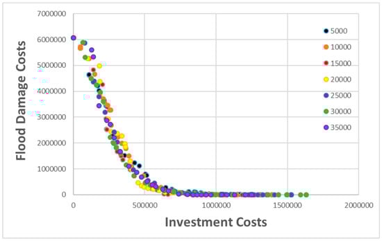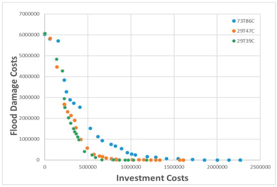 In this part of the methodology, the objective is to minimize two conflictive objective functions. The first represents the investment costs and the second represents the flood damage costs. These functions are linked such that, if more investments are made, flood damage costs will be reduced reciprocally.