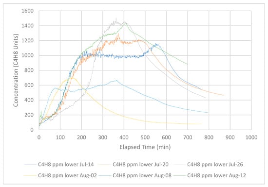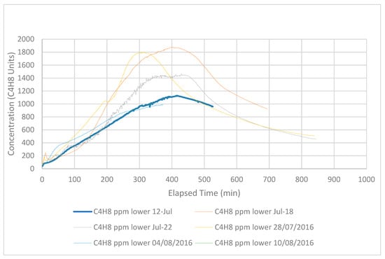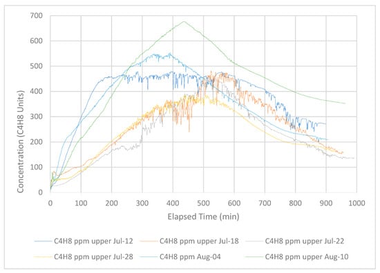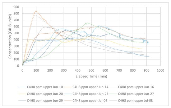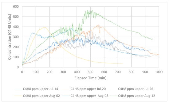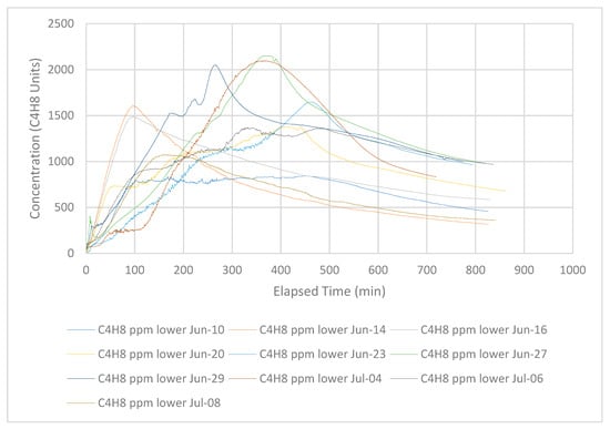Difference in concentration between lower and upper level (Figure 10) and the ratio of these values (Figure 11) relate to the potential for evaporation of solvent, dispersion into the airspace and ventilation of the structure induced by natural forces [10,11]. Peak values (tabulated in Table 1) provide an indication of the quantity of hydrocarbon vapor in the air at any point during the process observable within the limitation of the batteries in the instruments. The highest concentration at the upper level curves is very difficult to estimate since this remained almost constant once the broad plateau formed.