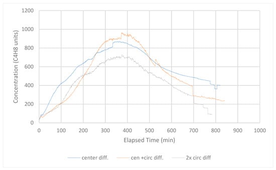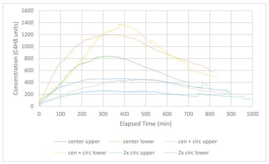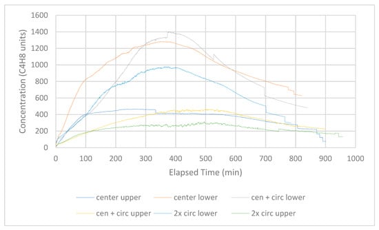 Air monitoring occurred using the Photoionization Device (PID) sensor in readily available, commercial four-gas testing instruments (GfG 460, GfG Instrumentation, Ann Arbor, MI, USA) [27,28,29]. The position of the instruments on the stand was 114 cm (45 in) and 38 cm (15 in) above the bottom, respectively. Hence, the instruments were about 76 cm apart from each other in the vertical direction. The sensors were calibrated using isobutylene and report concentration in “isobutylene units.” Where the focus of the study is the process and not discrimination of specific contaminants as in this situation, detection of the signal is all that has importance. The datalogger stored measurements once per minute. Previous experience had shown the absence of abnormal atmospheric conditions in the absence of contamination [10,11]. The yard contained no sources of contamination near the test chamber. Measurement occurred at two heights in the airspace over the period of the test (Figure 1). The instruments were calibrated according to recommendations of the manufacturer.