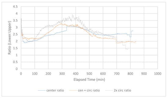 Lower-to-upper ratio of concentrations. (The abrupt changes in concentration reflect artifacts created from use of data from a smaller number of curves in calculating average concentrations. The instruments did not always operate for the longest possible time due to limitation in performance of individual batteries.)