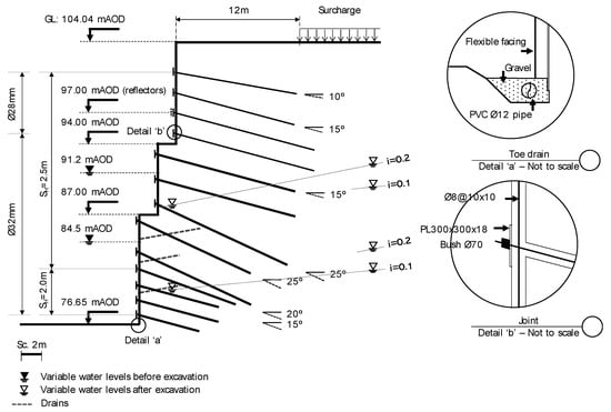 The benchmark problem used in this contribution is a 28 m deep vertical cut in 2 to 2.5 m high lifts, from ground surface at 104.7 m above ordnance datum (mAOD) to 76.65 mAOD, and supported with a top-down soil nail system in a heavily built setting []. Figure 1 shows a cross-section diagram of the supported excavation, and adjoining features. Figure 1 shows the variation of the water level at the face of the excavation and also the hydraulic gradient, during the course of excavation. A 40 m long section was adopted for the purpose of this paper, where the land terrain led to a maximum depth of excavation. The cut was excavated into seven soil layers and supported with three flexible reinforced shotcrete facings, divided with two 2 m wide soil benches, and 13 rows of soil nails, 6 to 14 m long, installed at a 10° to 25° inclination. Soil nail elements included 28 to 32 mm steel bars installed centrally in 700 to 850 mm drilled holes that were eventually filled with a sand-cement grout. The soil nails were spaced 2 to 2.5 m horizontally and 1.5 to 3 m vertically. The cut was benched at 10.04 and 17.04 mbgl. A series of 4 to 6 m long, 4-inch drain perforated PVC pipes were installed at 10° elevations, at 3.10, 6.10, and 8.35 m from the bed of excavation. Drains were connected by series of 0.3 m wide vertical geocomposite blankets installed between shotcrete facing and retained ground from 87.0 to 76.65 mAOD. An evenly distributed 49 kPa permanent surcharge (20 m run) was applied 12 m from the excavation crest, representing the contact pressure from the neighbouring six-storey residential buildings. Piezometric readings derived from the ground investigation report [] indicate a southward flow of groundwater, with a natural hydraulic gradient ranging from 0.1 to 0.2 (i.e., 1 to 2 m drop in every 10 m running perpendicular to project line—see Figure 1). The water level varied from 84.5 to 91.2 mAOD prior to construction. The system was designed for a mean 88 mAOD water level. Although commonly practiced, this is a substantial simplification, which reportedly led to excessive seepage and lateral displacement during the course of the staged excavation. Lateral ground movements were recorded using laser inclinometers at reflectors installed at 97 mAOD, five times each month to the end of the excavation. The northern wall section (covered by nine reflectors) was used for the purpose of this study, showing a cumulative lateral displacement of 115 mm, and a 61 mm horizontal displacement six months post-construction.