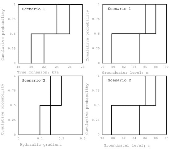 Drained cohesion (C’) and water level (G) were adopted as variables and used to build two random sets. The combined relationship between the two variables was presented in the form of a vector and defined by the 16 realisations arranged into four combinations, as illustrated in Equation (2) (below):
