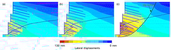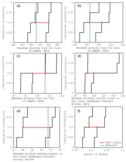 Limit states values pertinent to four realizations for each combination were sorted to derive the focal point extremes (i.e., minimum and maximum values). Middle values were discarded, and extremes were presented on the probability box in form of one step in the cumulative distribution function. As such, every step on the probability boxes represents extreme values for four random set combinations. Extreme values were sorted to form the upper and lower bound stepped line for each limit state. In Figure 3, the line marking the 0.5 cumulative probability represents the most likely values for each limit state, and the dashed line represents the index parameter either determined by the FHWA code of practice or measured in-situ. Lower and upper bounds are presented with stepped thick lines, with the space between representing possible values in the face of uncertain cohesion and water level. Table 4 summarises the design’s maximum axial force (Tmax) in soil nails 8 (submerged inner wall), 6 (middle wall), and 3 (outer wall) based on mean soil and water parameters. In Figure 4a–c, the design axial force for all walls falls within the probabilistically determined likely range and is relatively closer to the lower-bound line. This suggests that while the conventional design practice gives a reliable estimation of the soil nail axial force, variability of the water level can yield greater orders of axial loads, which is technically unexpected. While limit states are not reached and the system remains stable, the excessive axial forces in soil nails can impact the predicted ground lateral movements.