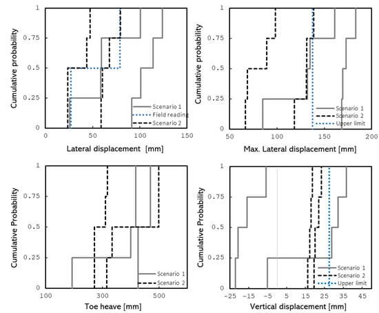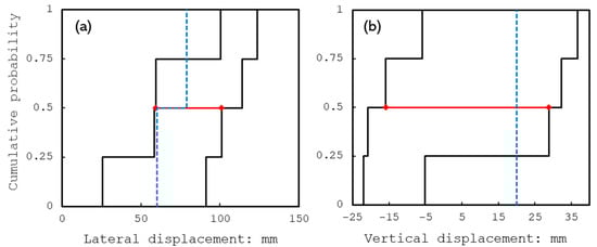 Figure 5 presents the p-box of the lateral and vertical displacement of the system in relevance with the measured lateral displacement at the end of construction and the design vertical displacement, taking the mean material properties and actions. The design’s vertical displacement and in-situ measured lateral displacements were within the bounds and within the most-likely values, which, in the case of vertical displacements, appears to be a broad range. As such, the random set framework does not appear to be as useful in determination of vertical displacements at ground level. This can be due to the poor choice of variables or small size of the ground investigation data sets [].