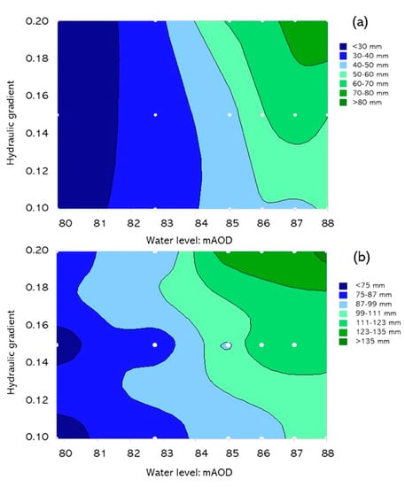 Impact on the lateral displacement of the water level and hydraulic gradient; (a) displacement at the reflector level (97 mAOD, near crest), (b) maximum displacement.