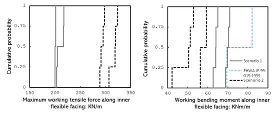 Using Equations (10) and (11), the mobilised bending moment on the critical submerged inner facing is 69.5 kNm·m−1, an order which is within the bounds of the upper and lower limit of the cumulative distribution function. It appears that the upper bound offers the most accurate estimation of mobilised moments, being consistent with the equivalent FHWA compliant index value (Figure 3e). Most likely the global factor of safety ranges between 1.094 to 1.120 (Figure 3f).