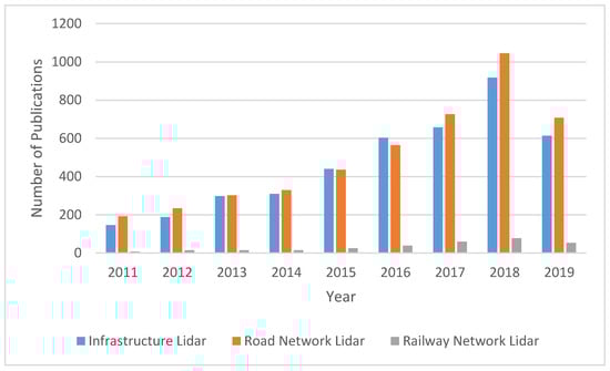The usage of new technologies for data acquisition, and tools that improve the decision making use of those data, are key elements for the development of a more efficient monitoring and maintenance of infrastructures. One of the most promising technologies that is being developed is LiDAR (Light Detection And Ranging)-based mapping systems. In Figure 1 it can be appreciated that the research related to the usage of LiDAR technology for infrastructure management applications has been growing during the last decade. This technology is able to collect dense three-dimensional representations of the environment, making it relevant for several fields besides infrastructure management (e.g., cultural heritage [], environmental monitoring []).