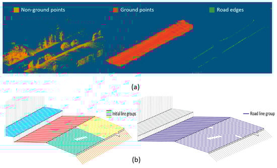 Road surface extraction. (a) Ibrahim and Lichti [] segment non-ground (left) and ground (center) using a density-based filter. Then, a 3D edge detection algorithm based on local morphology and Gaussian filtering extracts road edges (right). (b) Cabo et al. [] scan lines are grouped based on length, tilt angle and azimuth, and the initial groups (left) are joined following predefined rules using the vehicle trajectory to define the road surface (right).