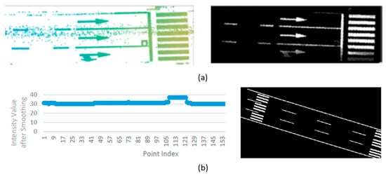 Road markings and driving lanes. (a) Soilán et al. [] apply an intensity filter on the point cloud (left) and generate a 2D GRF image representing the road markings (right). (b) Yan et al. [] propose a scan line-based method using the gradient of point intensity to detect road marking points on each scan line (left) and generate a 2D GRF image representing the road markings (right).