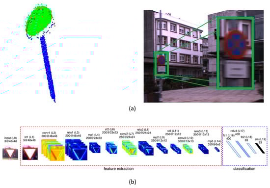 Traffic signs. (a) Soilán et al. [] detect traffic sign panels applying intensity filters on a previously segmented point cloud (left), define geometric parameters for each traffic sign and project the panel on georeferenced RGB images (right). (b) Arcos et al. [] classify those RGB images applying a Deep Neural Network that comprises convolutional and spatial transformer layers.