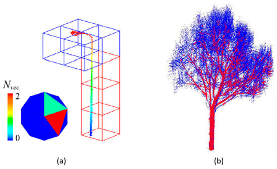 Pole-like objects and roadside trees. (a) Wang et al. [] recognize street objects using a voxel-based shape descriptor determined by the orientation of the significant eigenvectors of the object at several levels of an octree. Nvec represents the number of eigenvectors that intersect each triangle of the 3D descriptor (icosahedron) (b) Xu et al. [] recognize trunks (red) and tree branches (blue) by optimally merging clusters of points.