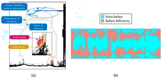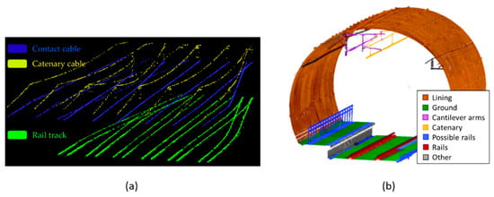 A summary of the most relevant applications of LiDAR data concerning the railway network is shown in this section. One way of classifying the existing works in relation to railway infrastructure recognition and inspection may be by attending to the collection methods used to obtain the 3D point clouds. Likewise, Lou et al. [] proposed a classification based on the methods followed for classifying points. Based on this, three main categories were proposed: (i) data-driven and model-driven methods, using point features and geometrical relationships; (ii) learning-based methods, which use imagery data and/or MLS point data; and (iii) multi-source data fusion methods [,,,,,]. Although other classification proposals also can be considered, the classification in this paper is made attending to the main goal, or application of each work (Figure 7), as proposed in Che et al. [], where a review about object recognition, segmentation and classification using MLS point clouds in different environments, such as forest, railway and urban areas, is presented. Additionally, several figures (Figure 8, Figure 9, Figure 10, Figure 11 and Figure 12) provide extra context to some of the works cited throughout the subsequent sections.