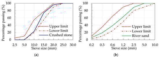 Sandstone and river sand were used as crushed coarse and fine aggregates. Figure 1a,b show the particle size distribution curves of both coarse and fine aggregates. Coarse aggregates had 20 mm maximum grain size with 2.64 g/cm3 specific gravity. River sand had 2.59 g/cm3 specific gravity, 2.55% water absorption, and 2.83 fineness modulus.