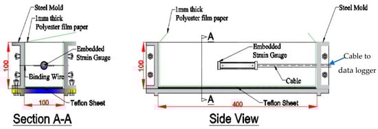 A pan type concrete mixer was used for all concrete mix proportions and batching was conducted according to the mix designs and as specified in JIS A 1119: 2014 Method of test for variability of freshly mixed concrete by measuring mortar and coarse aggregate contents [13], JIS A 1138: 2005 Method of making test sample of concrete in the laboratory [14], and ASTM C192/C192M: 2002 Standard practice for making and curing concrete test specimens in the laboratory [15]. Air entraining agent (AE) and water reducing agent (AEWR) were used in all the mix proportions. AEWR dosage was kept constant as recommended by the manufacturer, whereas AE was varied to achieve target concrete air content. Fresh concrete properties such as slump, air content, and temperature were measured just after casting, according to JIS or ASTM standards [16,17,18,19,20,21,22,23]. Transducer strain gauges and data logger were used to measure concrete strain and temperature throughout the study period. The gauges were installed in the central portion of 100 × 100 × 400 mm beam molds, as shown in Figure 2. Specimens for compressive strength tests were prepared, according to JIS A 1108: 2006 Method of test for compressive strength of concrete [24] and ASTM C39/C39M: 2005 Standard test method for compressive strength of cylindrical concrete specimens [25], using (100 mm diameter and 200 mm height) cylinder molds. Temperature rise, due to heat of cement hydration, was measured under semi-adiabatic condition in cubic molds with internal dimensions of 200 mm made of foamed polystyrene of 200 mm thick. Setting time of concrete was determined according to JIS A 1147: 2007 Method of test for setting time by penetration resistance [26] and ASTM C403/C403M: 1999 Standard test method for time of setting of concrete mixtures by penetration resistance [27].