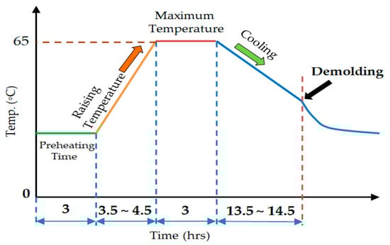 Immediately after casting, all specimens were sealed and stored in a temperature-controlled room at 20 °C and 80% relative humidity (RH) [18]. Some selected beams, together with cylinder specimens, for 1-, 7-, and 14-day compressive strength tests were then subjected to high temperature curing, 3 h after casting time. Figure 3 shows the target ambient temperature profile used in the experiments. This profile was similar to a typical steam curing process in general precast concrete factories. In this study, steam was not applied. The remaining beam and cylinder molds were kept in a temperature-controlled room at 20 °C and 80% RH; strain and temperature was measured in beam specimens as well. Accelerated curing was conducted on three mix proportions on the same day. Thus, twelve (12) mix proportions were cast and cured on four (4) different days.