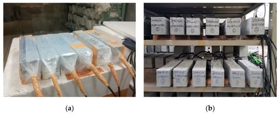 After 24 h, all specimens were demolded. All the accelerated cured specimens were then subjected to drying condition in a different temperature-controlled room at 20 °C and RH 60%. Drying shrinkage was measured in beams specimens using data logger. Beam specimens which were stored in the temperature-controlled room at 20 °C were sealed with aluminum adhesive tape for measuring autogenous shrinkage. The storage condition for both sealed and drying condition of beam specimens are shown in Figure 4. The cylinder specimens for the 28-day compressive strength test were stored in water at 20 °C.