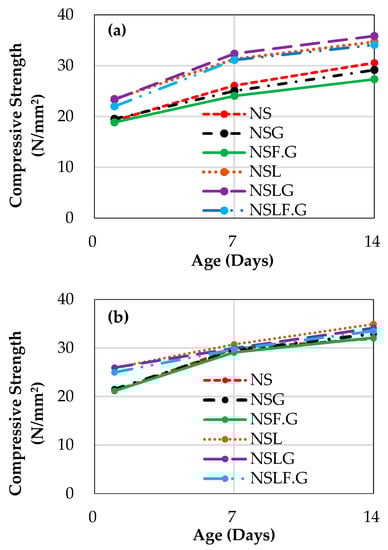 Compressive strength at 1 day, 7 days, and 14 days for accelerated cured S3000 (a) and S4000 (b).