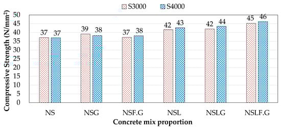 Compressive strength for water cured S3000 and S4000 concrete at 28 days.